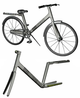 While I am posting, I’ll mention this link to a city bike project that a reader, Casper, recently sent to me. The project bike, shown here, was designed by students at the Koln International School of Design in Cologne, Germany. You can see some of the design details, including what I assume to be an integrated GPS based cyclocomputer/ navigation system and a modular carrying rack with compartments for tools and supplies, on the project website.