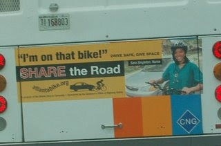 Since this blog has readers all over the world, many of you living in bike friendly cities, I thought it would be a good idea to pose the question; Do any of you have “Share the Road” message on buses, bus stops, etc in your town? In particular, I would love to hear success stories about such programs in other cities. If any of you could let me know about them with a comment or an email, I would greatly appreciate it.