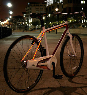 The lights are powered by a battery pack attached to the bottom of the seatpost inside the frame. The batteries are recharged from the dynamo front hub enabling the lights to never need any external power source other than the power produced by the cyclist. The electroluminescent wire is encased in silicon protecting the electrics from the elements. The Integration lighting system is not only convenient but also reduces the risk of accessory theft.”