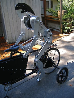 I talked a bit about electric bikes in my last post, so today I will share a different take on that subject. Meet Joules, the stoker on Carl’s home built electric tandem. Carl challenged himself by asking, “Could I build an electric tandem based on actually pumping the pedals?” The result is a design that is indirectly driven by a PMG-132 electric motor through a linkage that simulates the motion of human legs pedaling. Carl points out on the Endless-sphere E- bike forum that: